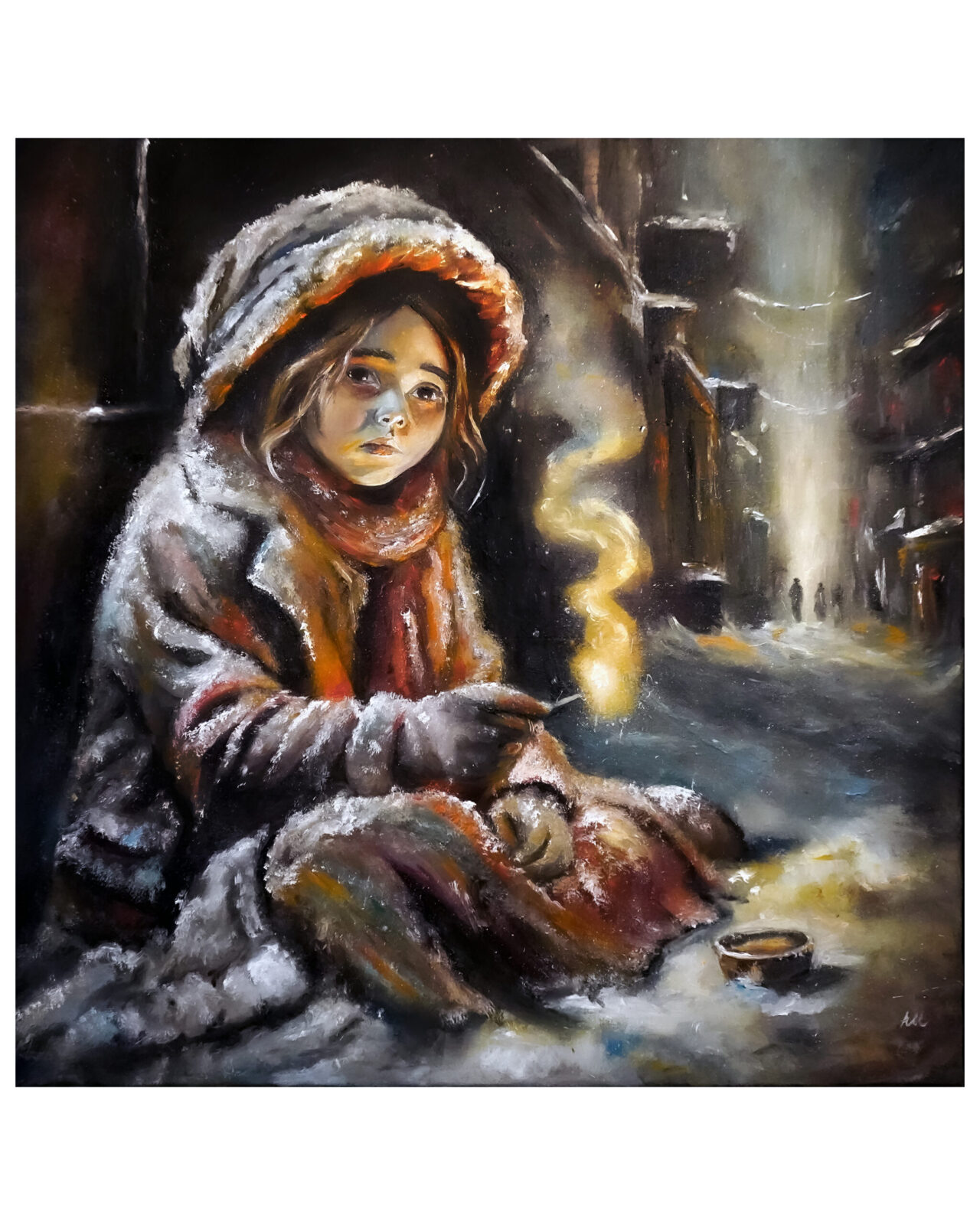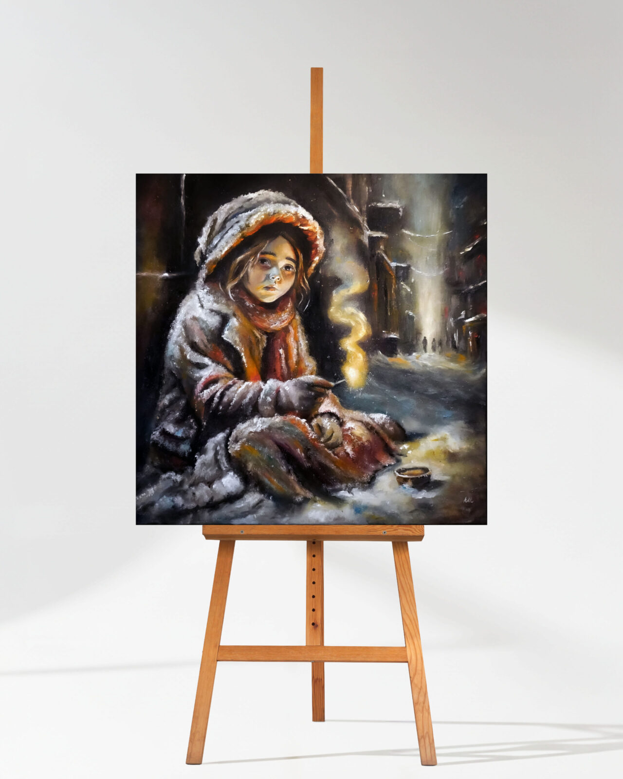 Prezentowane dzieło to poruszająca interpretacja klasycznej baśni, uchwycona w charakterystycznym dla Andżeliki Kucharskiej, neo-figuratywnym i lekko surrealistycznym stylu. Centralnym punktem kompozycji jest mała, kuląca się postać Dziewczynki, zagubiona w mrocznym, lodowatym świecie wąskiego pasażu starego miasta. Artystka po mistrzowsku operuje światłocieniem (chiaroscuro) – blask pojedynczej zapalonej zapałki, trzymanej w drobnych dłoniach, stanowi jedyne, ciepłe źródło światła, poetycko rozjaśniające jej zmęczoną, ale pełną nadziei twarz i kontrastujące z głębokimi, chłodnymi błękitami i szarościami otoczenia.