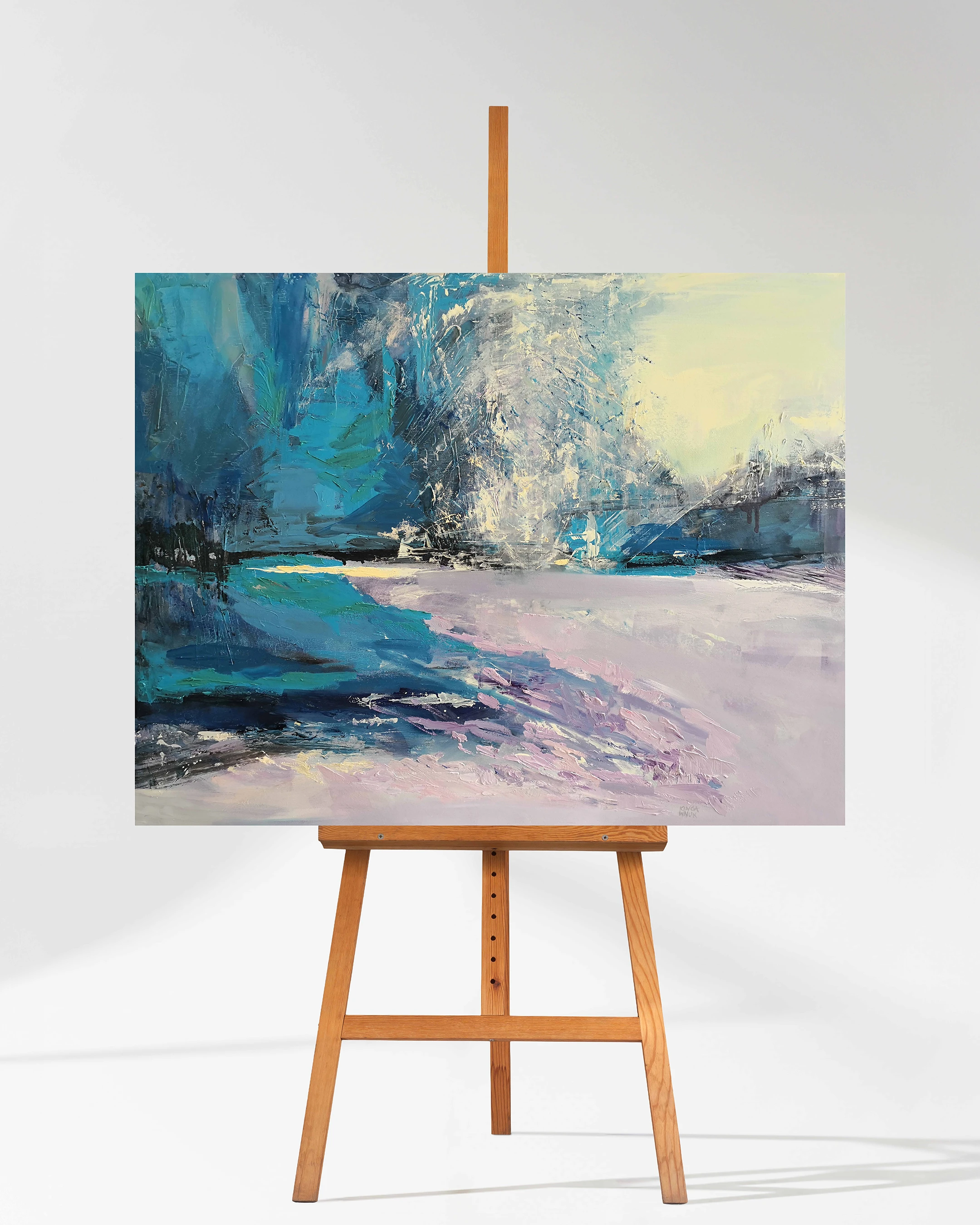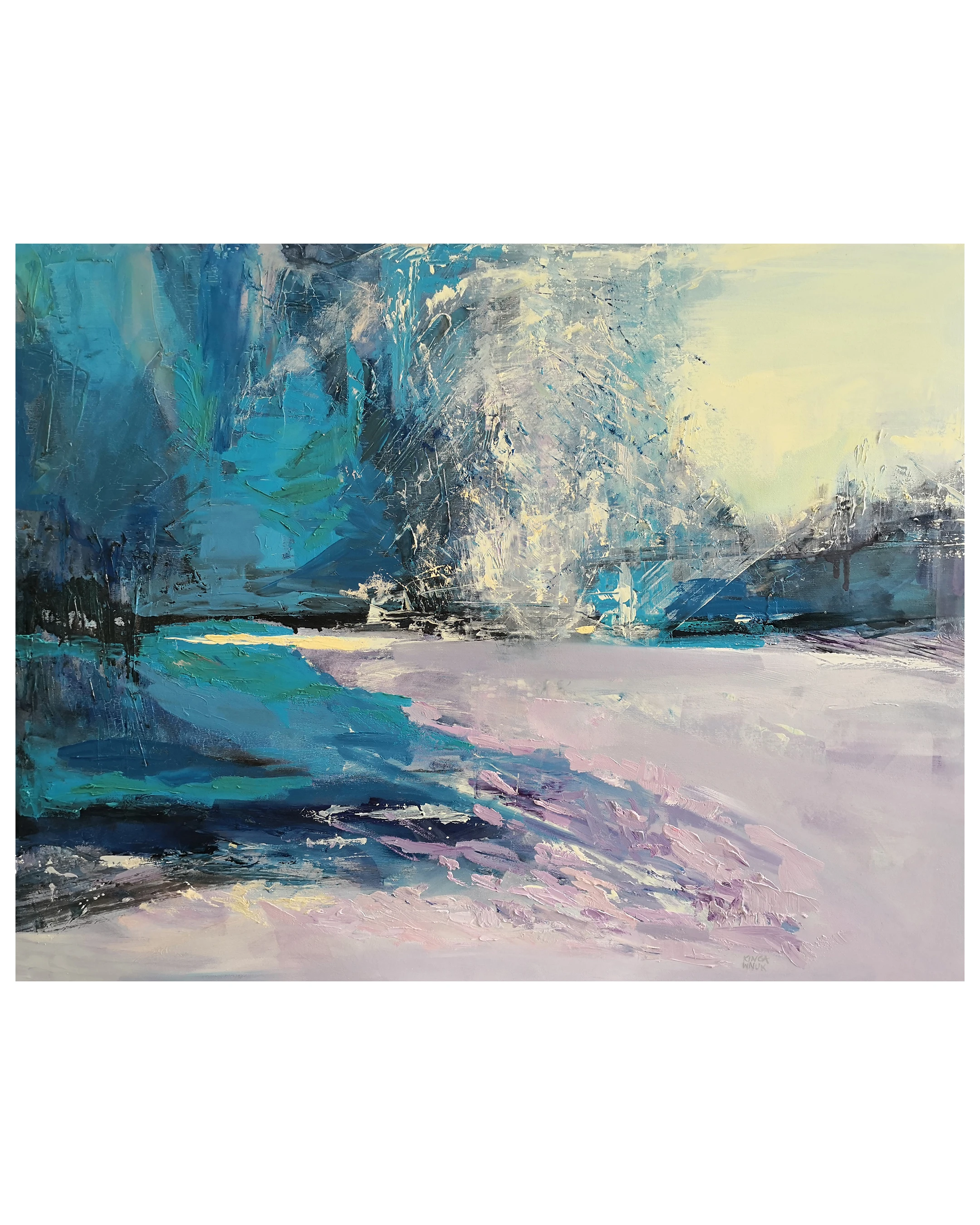 Niezwykle ekspresyjny pejzaż olejny, śmiało balansujący na granicy figuracji i abstrakcji. Obraz przyciąga wzrok bogatą, trójwymiarową fakturą – grube impasty nakładane szpachlą malarską budują silną dynamikę kompozycji, ewokując topniejące śniegi i żywiołowość budzącej się do życia górskiej przyrody. Głębokie, chłodne błękity i turkusy gwałtownie zderzają się tu z subtelnymi, wpadającymi w biel fioletami i ciepłym światłem tła. To mistrzowskie, na poły oniryczne studium wiosennego przesilenia w Gorcach, pełne wewnętrznego napięcia i surowego piękna.