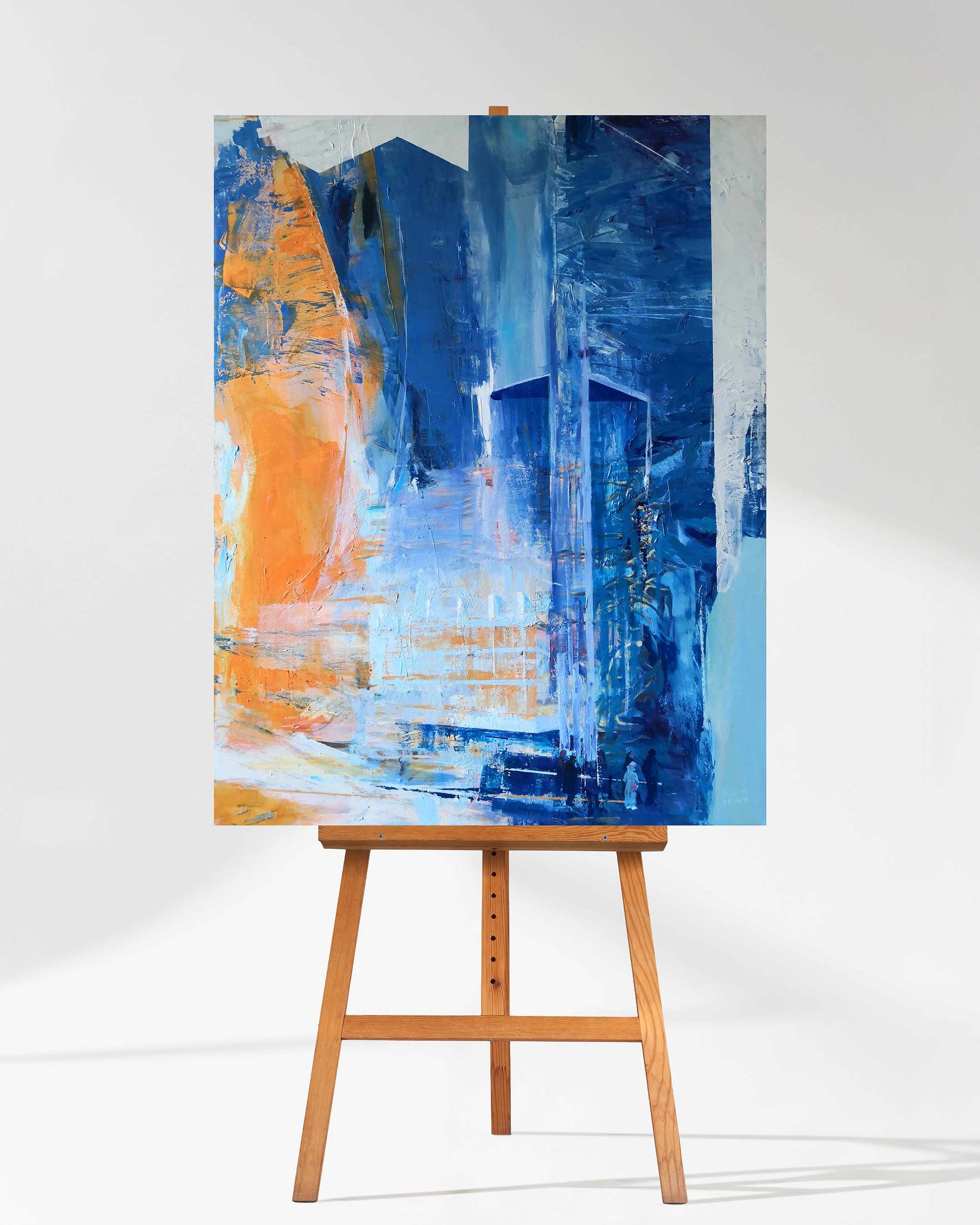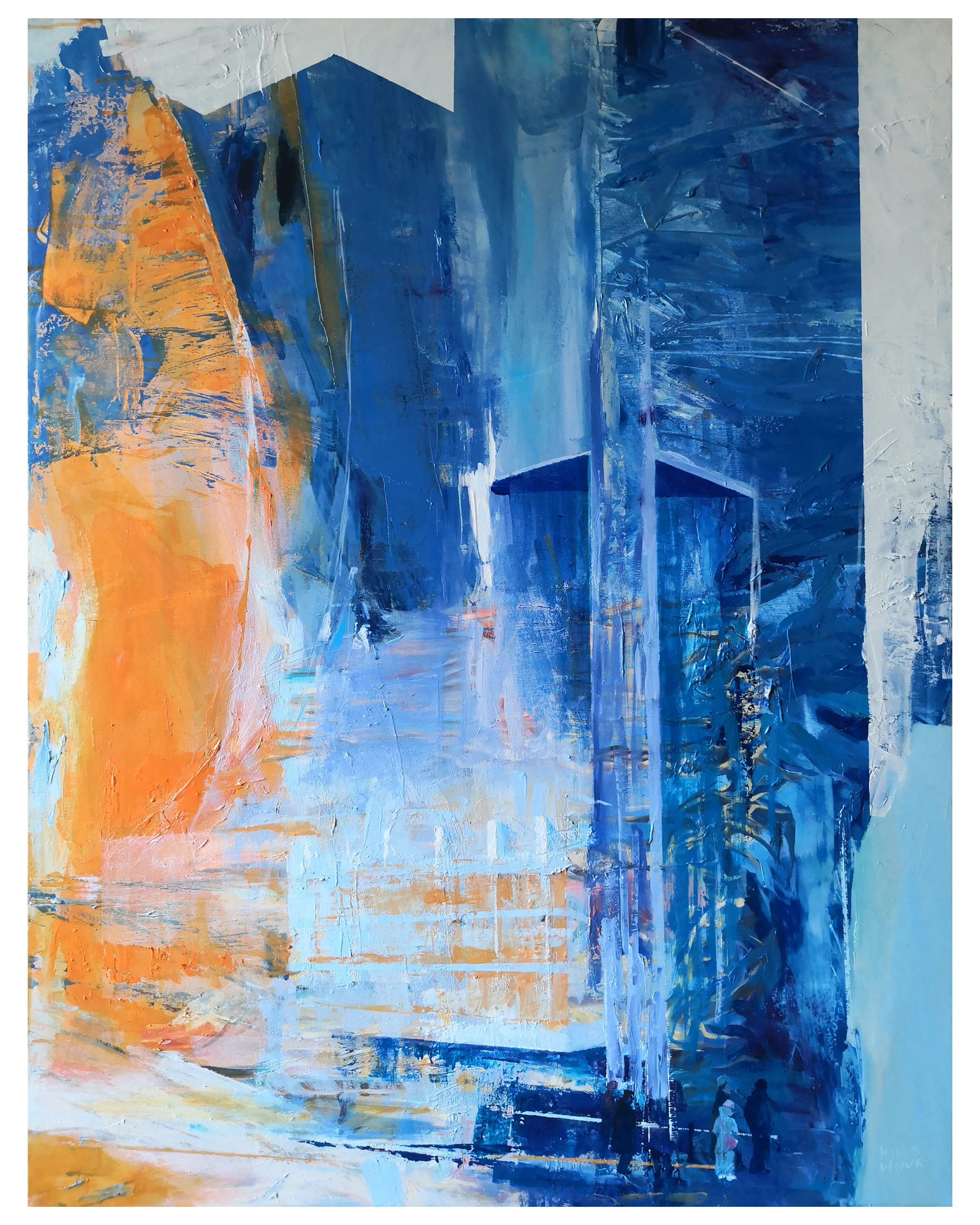 „Odcienie popołudnia” to podróż wgłąb tkanki miejskiej, gdzie granica między architekturą a emocją ulega zatarciu. Kinga Wnuk-Moskalska zamyka na płótnie ulotność chwili – ten krótki moment, w którym miasto zmienia swoją barwę z chłodnego błękitu dnia w ciepły blask wieczoru. To praca o dużej sile wyrazu, która wnosi do wnętrza nowoczesną elegancję i dynamizm współczesnego malarstwa figuratywnego.