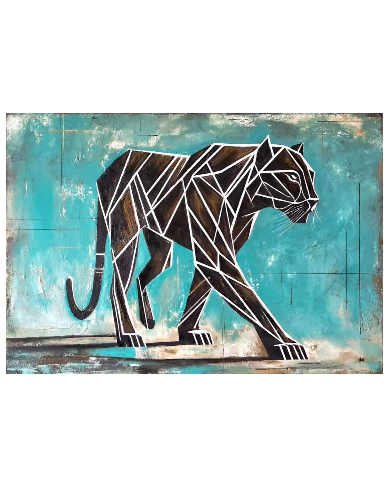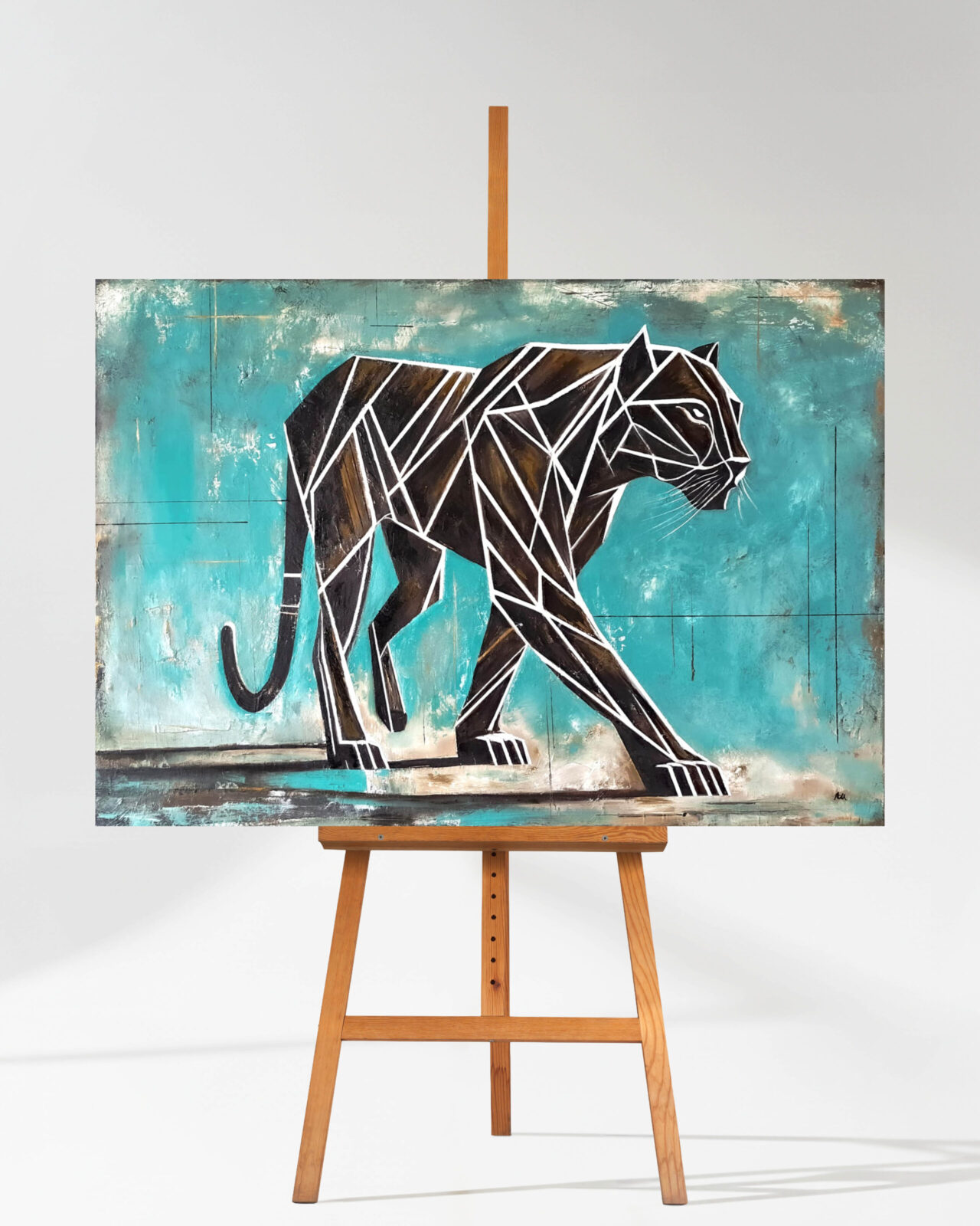 Opis produktu: „Nyx” to fascynujące połączenie natury i geometrycznej abstrakcji. Dzieło przedstawia kroczącą panterę, której sylwetka została rozbita na ostre, dynamiczne płaszczyzny, tworząc nowoczesną, niemal architektoniczną formę. Artystka po mistrzowsku zestawia surową, ciemną figurę drapieżnika z wibrującym tłem w odcieniach intensywnego turkusu i błękitu morskiego. Dzięki technologii Giclée, każdy detal liniowej konstrukcji oraz subtelne przejścia tonalne tła są oddane z niezwykłą precyzją, zachowując energię i głębię oryginalnego obrazu.