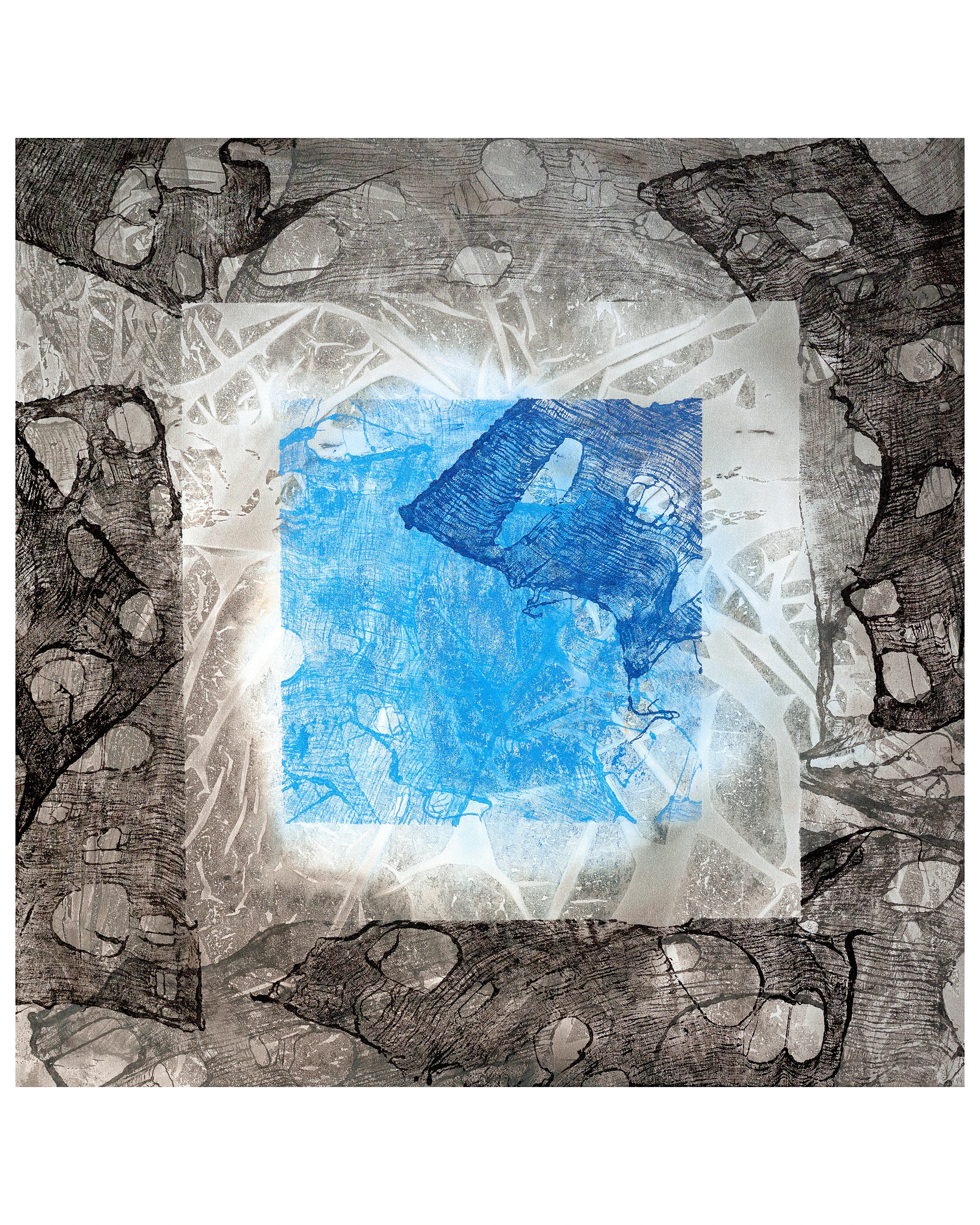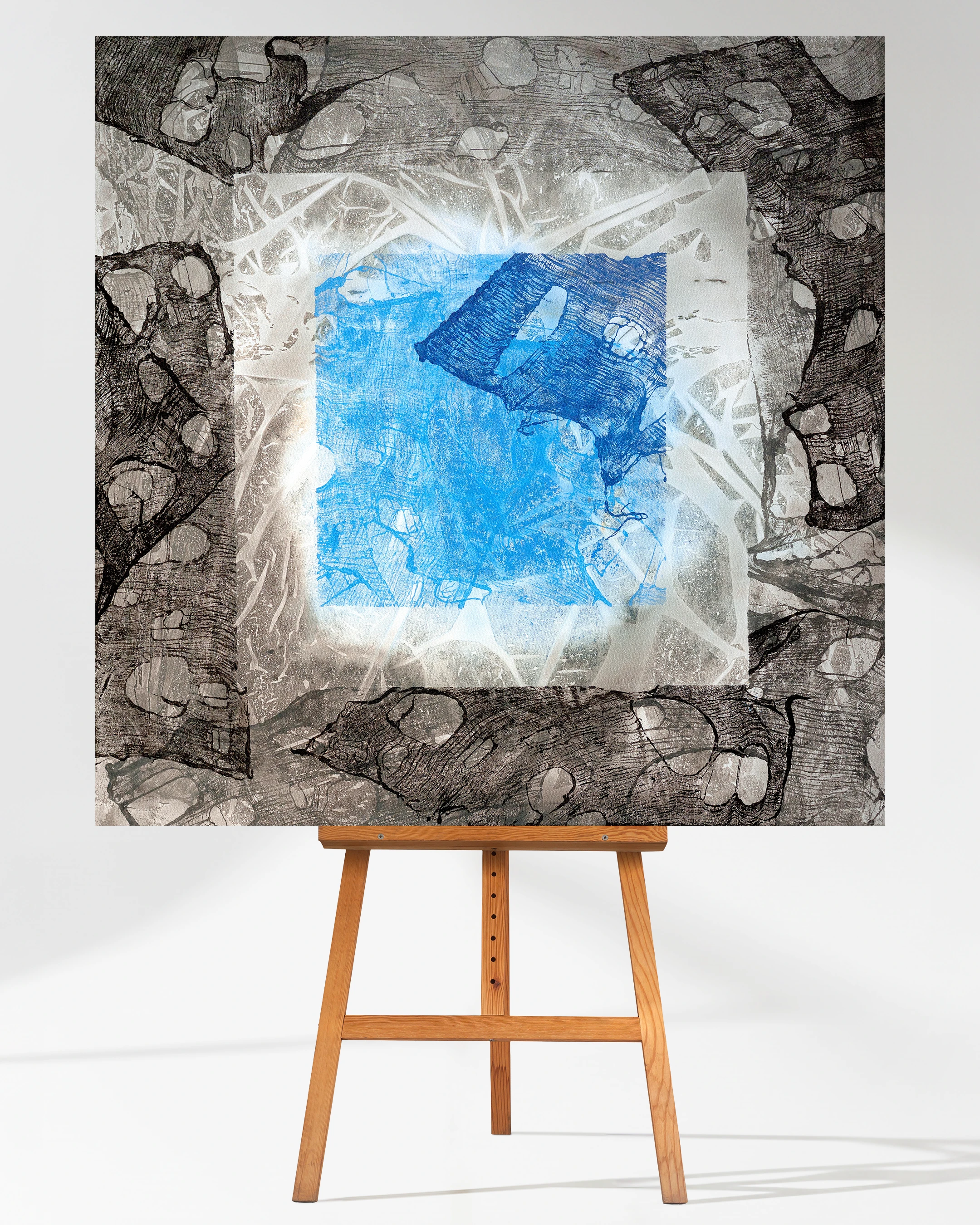 „Inner Shelter” to obraz o potrzebie schronienia w sobie. Jasnoniebieskie centrum przypomina bezpieczną przestrzeń – cichą, spokojną, oddzieloną od cięższej, surowej rzeczywistości na zewnątrz. Ciemniejsze formy wokół tworzą jakby ochronną ramę, barierę, która nie pozwala światu zbyt łatwo wkroczyć do środka.