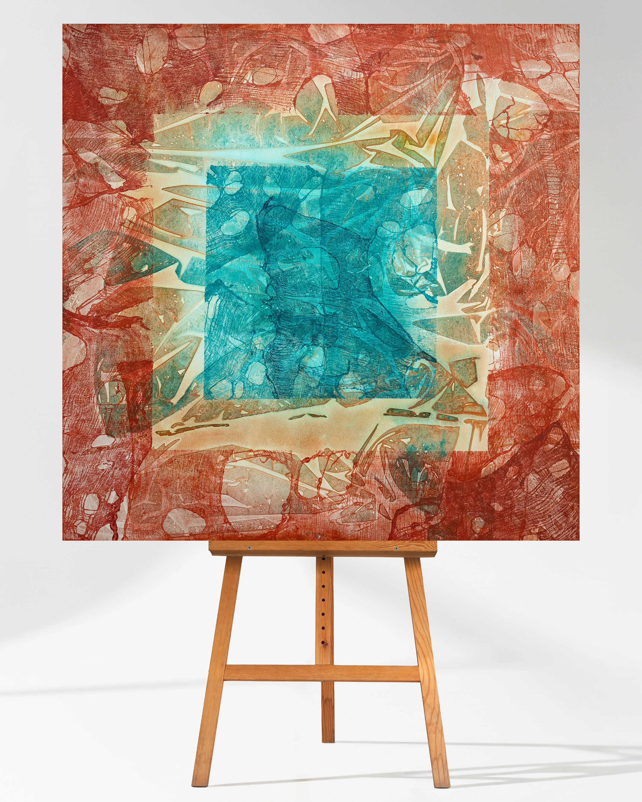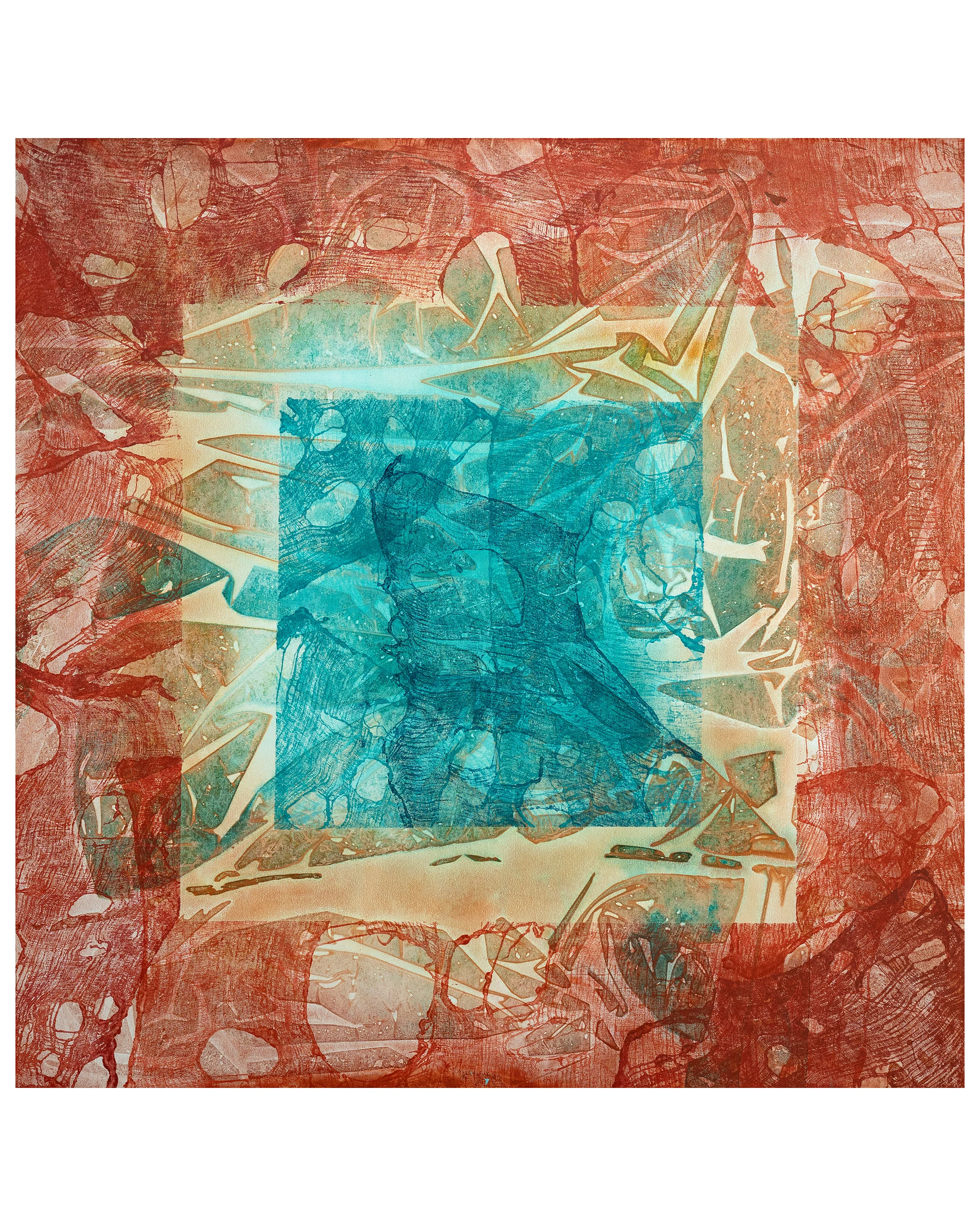 „Can’t Touch Me” to portret chwili, w której człowiek zamyka się w sobie, tworząc chłodną, bezpieczną przestrzeń odciętą od świata. Intensywne czerwienie wokół zdają się napierać, symbolizując emocje, konflikty i bodźce z zewnątrz, podczas gdy chłodny, niebieski środek przypomina bryłę lodu — cichą, zamrożoną, niedostępną.