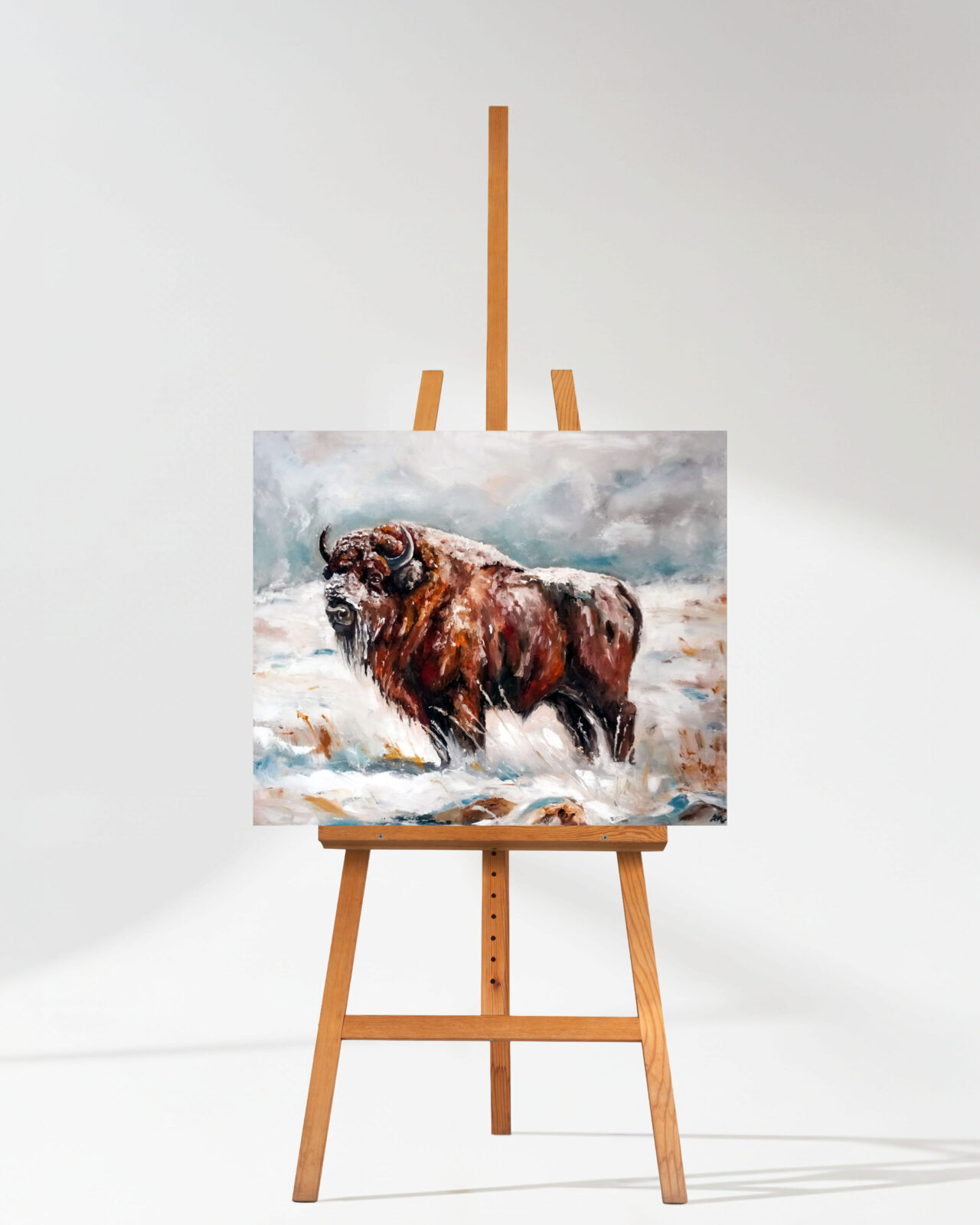 Opis produktu: „Wisent” to potężne i majestatyczne studium siły oraz przetrwania. Dzieło przedstawia żubra – króla puszczy – dumnie stojącego pośród zimowego krajobrazu. Artystka po mistrzowsku oddała ciężar i fakturę potężnej sylwetki zwierzęcia, kontrastując ją z lekką, niemal eteryczną bielą śnieżnego tła. Dzięki technologii Giclée, każdy energiczny ruch szpachli i pędzla oraz niuanse brązów i szarości są odwzorowane z niezwykłą wiernością, oddając pełną skalę i dostojeństwo oryginału.
